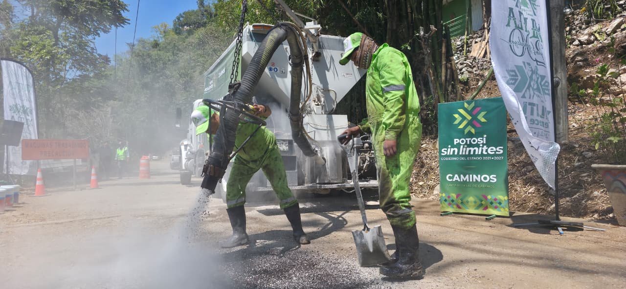 En la Huasteca, avanzan trabajos como la rehabilitación del camino Comoca–Axtla de Terrazas y la modernización del tramo Oclamecayo–El Potrero.